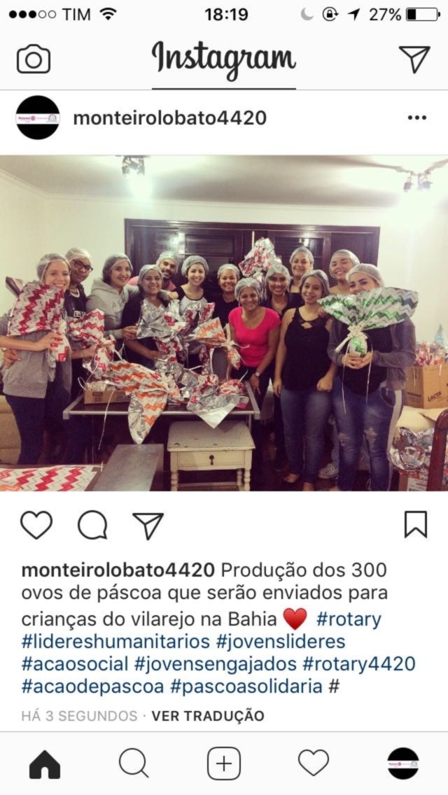 Em uma iniciativa coordenada pela companheira Mônica Magalhães Ramos do E-Club4420, os interactianos e rotaractianos Monteiro Lobato, uniram-se em uma força tarefa solidária para arrecadar ovos de Páscoa e chocolates destinados à alegrar centenas de crianças do povoado de Brejo Grande na cidade de Boquira, localizada no centro sul do estado da Bahia. A ação foi tão contagiante que os próprios funcionários do estabelecimento onde ocorreu a ação, se juntaram à nossa força jovem para solicitar doações à seus clientes.