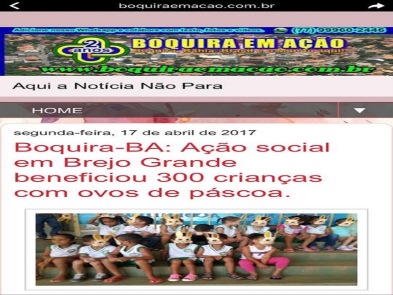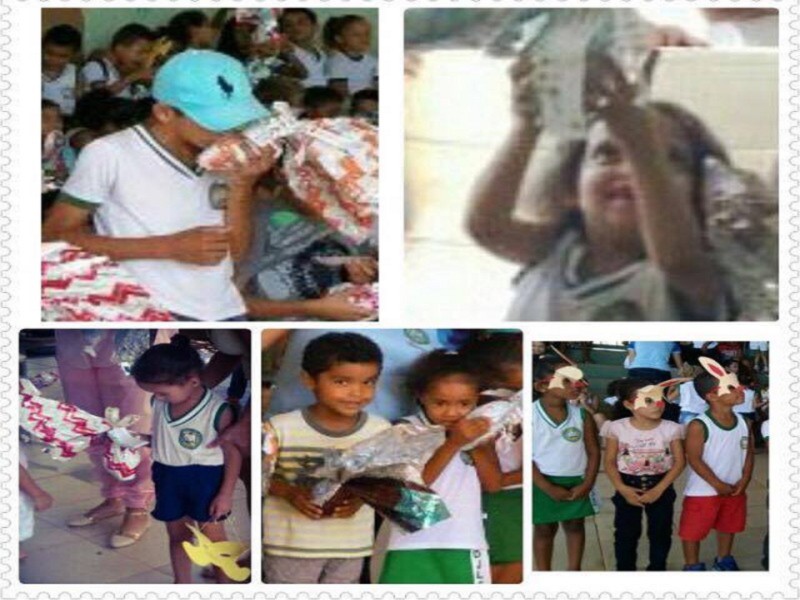 O Rotary E-club o Rotaract e o Interact Monteiro Lobato, junto com o apoio de outras Ongs, realizaram a ação social em Boquira na Bahia, povoado de Brejo Grande beneficiando 300 crianças com ovos de pascoa. As doações vieram de vários companheiros e outros parceiros, os ovos foram todos confeccionados na casa da companheira do E-club Monica Magalhães, formou-se uma grande corrente do bem. Conseguimos parceiria com a Ong Jovens do Sopão para o transporte gratuito e a companheira organizou com os professores da única escola deste povoado a entrega dos Ovos de Pascoa neste domingo. Que se tornou um grande evento no local.
